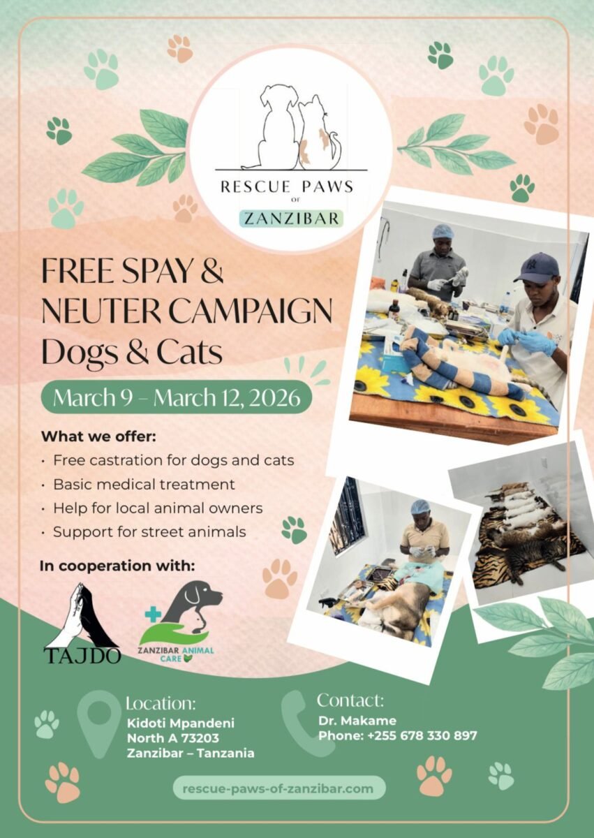 In cooperation with Tajdo and Zanzibar Animal Care, we will be performing free neutering and spaying of dogs and cats from March 9 to 12, 2026. At the same time, basic medical treatment will be provided. Our goal is to help local pet owners and stray animals.